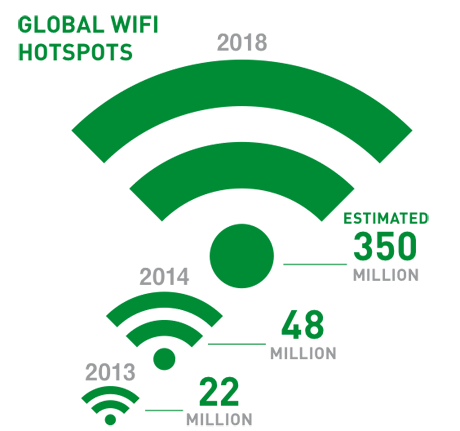 - In 2014, there were 48 million Wi-Fi hotspots globally, double the 2013 figure, according to a survey by iPass, who predict that by 2018 there will be nearly 350 million – or approximately one for every 20 people in the world.
