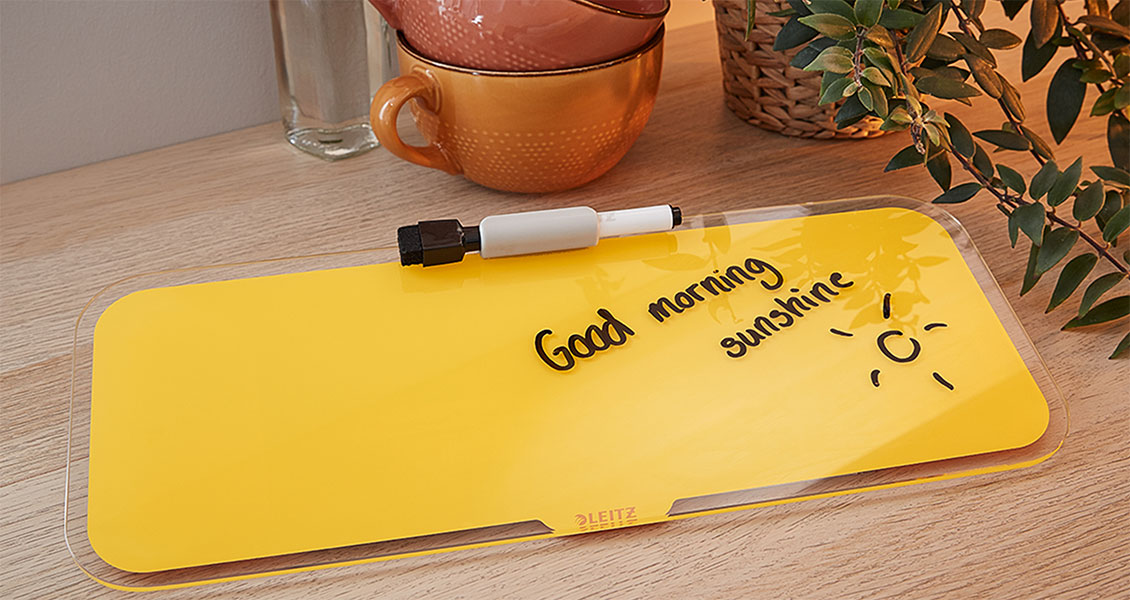 At Leitz, we have two options for your desktop memo board – our A4 glass desktop easel and our glass desk notepad. Both are made from tempered safety glass for durability and come with a dry erase pen for you to take your notes. They’re also magnetic, so you can fix extra notes to them if needed.