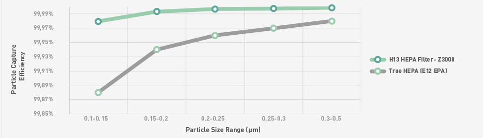 A typical 'True HEPA' filter can capture 99.97% of particles at 0.3 micron but they achieve a lower efficiency level at the MPPS (0.1-0.2 micron) so overall they are less efficient than an H13 HEPA. Likewise, an H13 HEPA will be more efficient than 99.97% at 0.3 micron, which is what a ‘True HEPA’ is tested to.